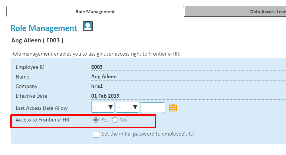 Go to Personnel > Processes > Access Rights, select the employee and set the 'Access to Frontier Ehr to 'Yes'.