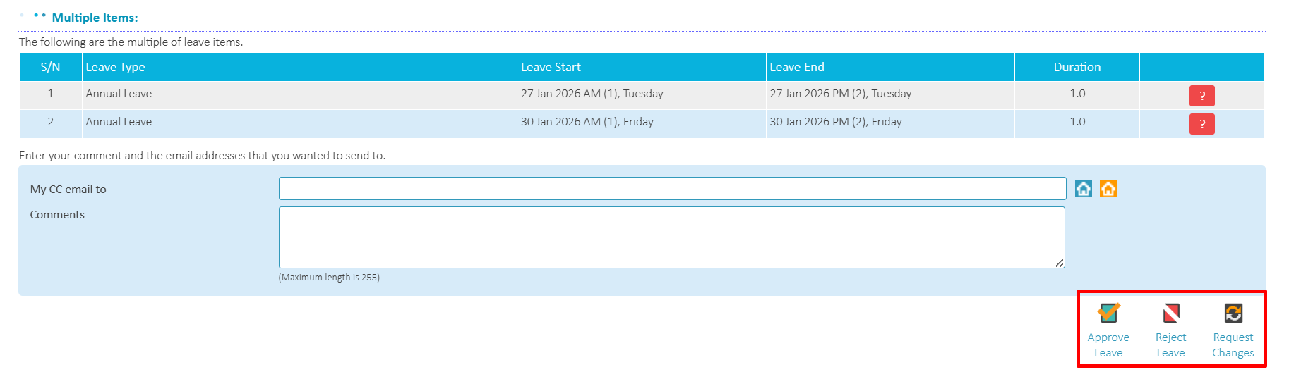 The Manager/Administrator will be able to see and click the <Approve Leave>, <Reject Leave> or <Request changes> buttons in the following screen.